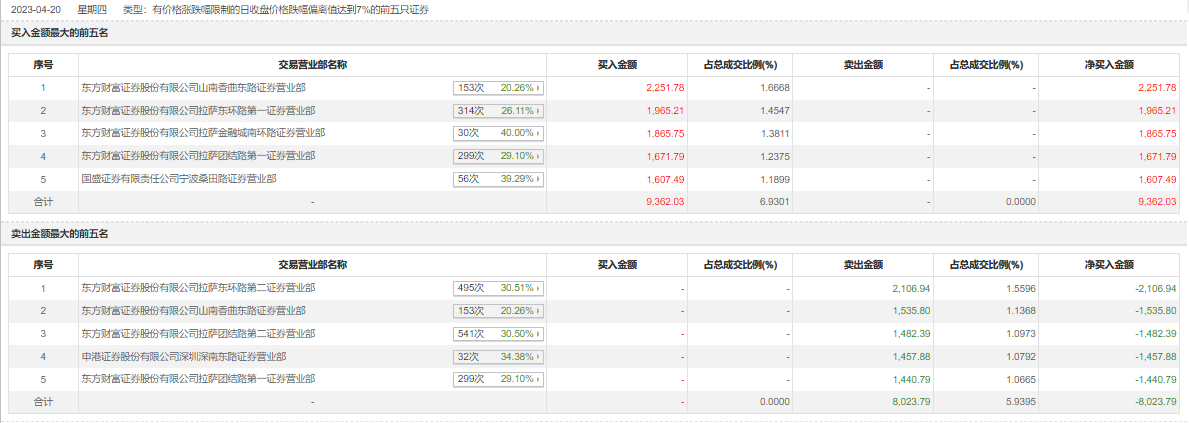 4月20日,曲江文旅今日跌9.05%,龙虎榜数据显示,上榜营业部席位全天成交1.74亿元,占当日总成交金额比例为12.87%。其中,买入金额为9362.03万元,卖出金额为8023.79万元,合计净买入1338.23万元。具体来看,知名游资现身龙虎榜,宁波桑田路(国盛证券有限责任公司宁波桑田路证券营业部)净买入1607.49万元。此外,东方财富证券拉萨东环路第二证券营业部、东方财富证券山南香曲东路证券营业部分别卖出2106.94万元、1535.80万元;东方财富证券山南香曲东路证券营业部、东方财富证券拉萨东环路第一证券营业部分别买入2251.78万元、1965.21万元。