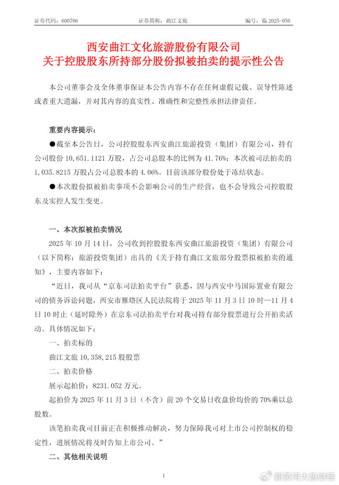 近日,曲江文旅(600706.SH)再度成为资本市场的焦点。继10月13日—14日控股股东西安曲江旅游投资(集团)有限公司(以下简称“曲江旅投”)所持1221万股股票成功拍卖后,公司于10月15日晚间公告,因与西安中马国际置业有限公司的债务诉讼问题,将于11月3日起对曲江旅投持有的1035.82万股公司股票进行公开拍卖,起拍价8231.052万元,此次拍卖股份占公司总股本的4.06%。