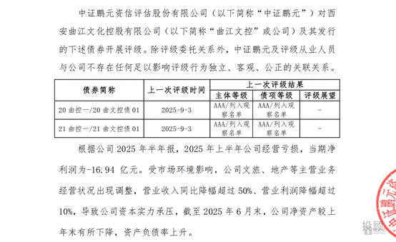 2025年10月13日,中证鹏元资信评估股份有限公司将21曲文控债01(2180301.IB)、21曲控一(152980.SH)的债项评级列入评级观察(走势不明) ,当前评级为AAA的西安曲江文化控股有限公司主体和债项评级目前均为AAA,同时被列入观察名单。