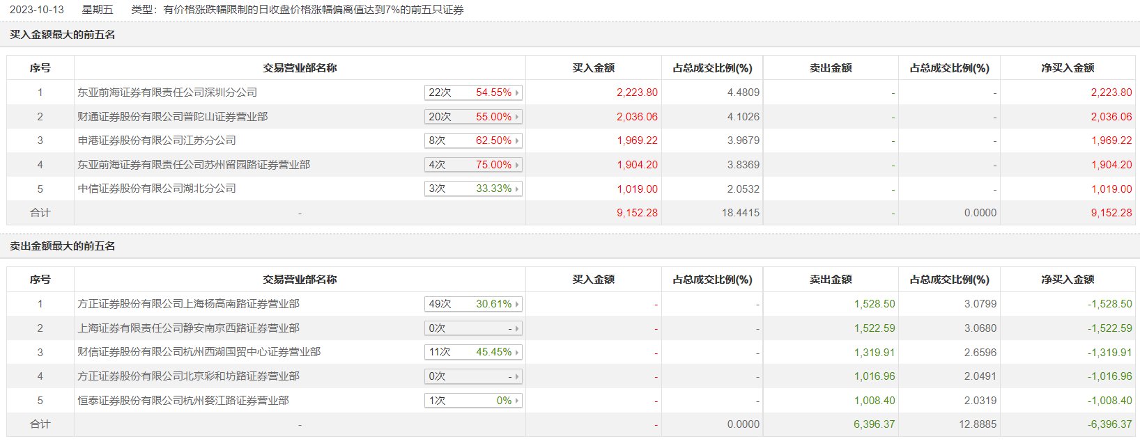 其中,东亚前海证券深圳分公司、财通证券普陀山证券营业部分别买入2223.80万元、2036.06万元;方正证券上海杨高南路证券营业部、上海证券静安南京西路证券营业部分别卖出1528.50万元、1522.59万元。