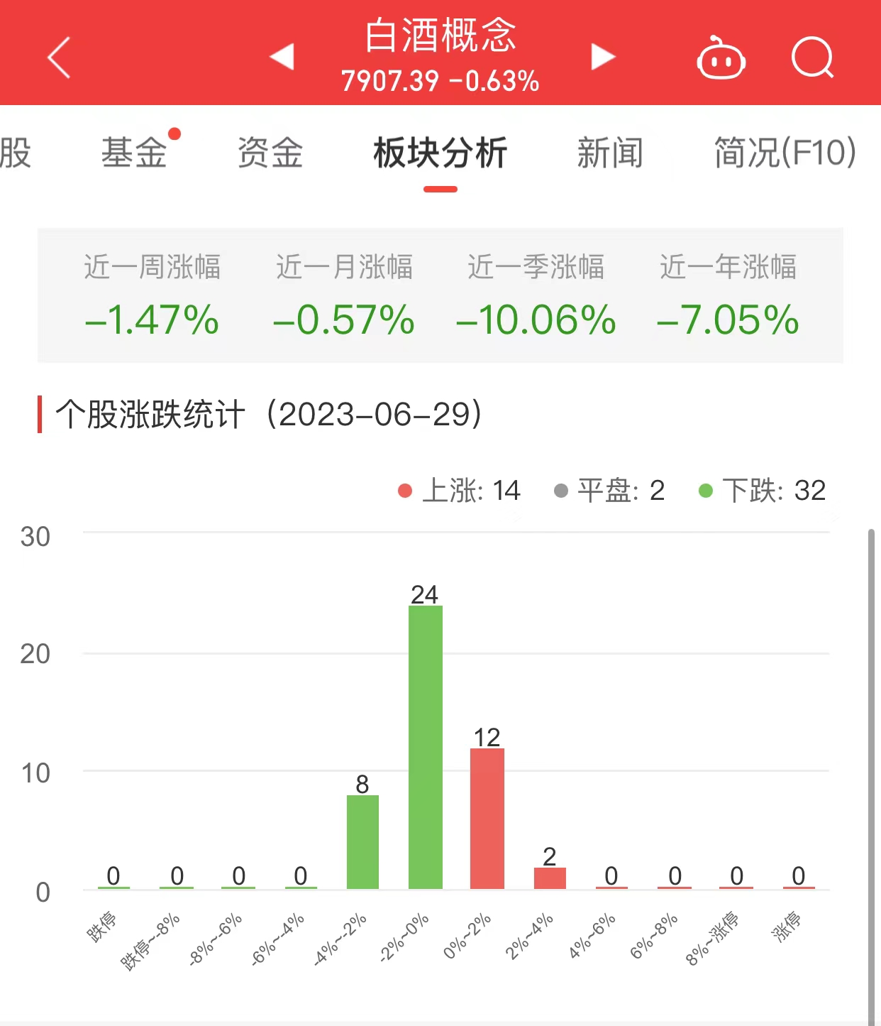 中国经济网北京6月29日讯今日,白酒概念板块整体跌幅0.63%,其中14只股票上涨,2只股票平盘,32只股票下跌。