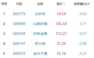 水井坊、山西汾酒、泸州老窖、伊力特、老白干酒位列涨幅榜后五位,涨幅分别为-3.63%、-3.11%、-2.57%、-2.40%、-2.37%。