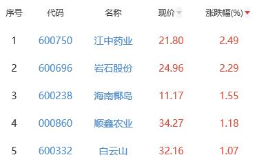 其中,江中药业、岩石股份、海南椰岛、顺鑫农业、白云山位列板块涨幅前五位,涨幅分别为2.49%、2.29%、1.55%、1.18%、1.07%。
