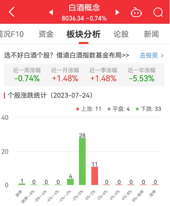 中国经济网北京7月24日讯今日,白酒概念板块整体跌幅0.74%,其中11只股票上涨,4只股票平盘,33只股票下跌。