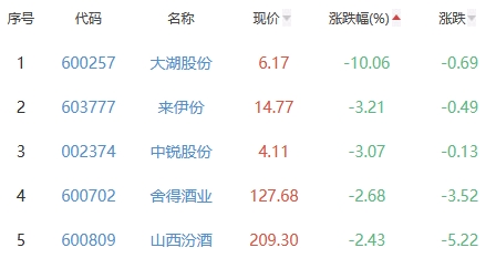 大湖股份、来伊份、中锐股份、舍得酒业、山西汾酒位列涨幅榜后五位,涨幅分别为-10.06%、-3.21%、-3.07%、-2.68%、-2.43%。