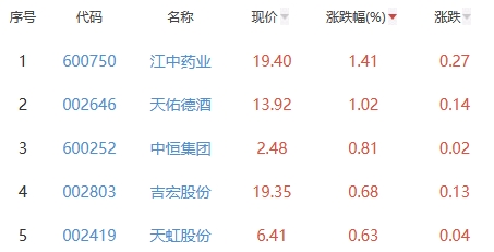 其中,江中药业、天佑德酒、中恒集团、吉宏股份、天虹股份位列板块涨幅前五位,涨幅分别为1.41%、1.02%、0.81%、0.68%、0.63%。