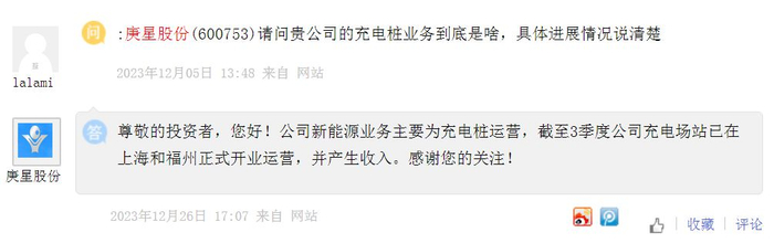 此外,庚星股份2023年12月26日在投资者互动平台表示,公司新能源业务主要为充电桩运营,截至3季度公司充电场站已在上海和福州正式开业运营,并产生收入。