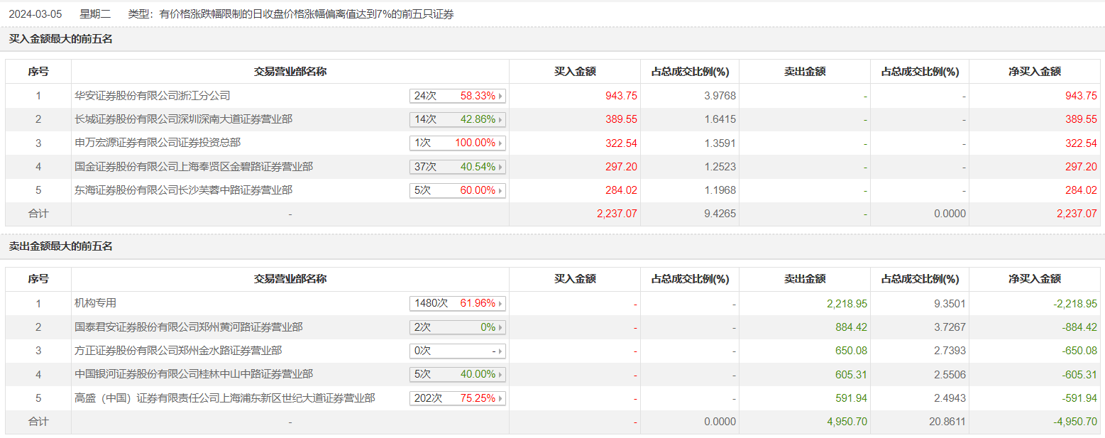 汉商集团3月5日涨停,龙虎榜数据显示,上榜营业部席位全天成交7187.77万元,占当日总成交金额比例为30.29%。其中,买入金额为2237.07万元,卖出金额为4950.7万元,合计净卖出2713.63万元。