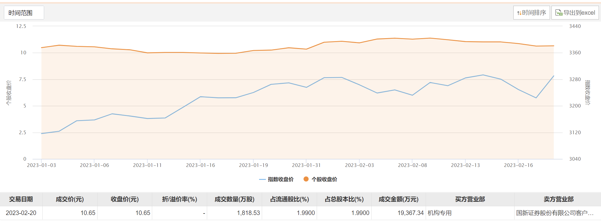 大宗交易成交1818.53万股,成交额1.94亿元,占当日总成交额的66.12%,成交价10.65元/股,较市场收盘价10.65元/股持平。