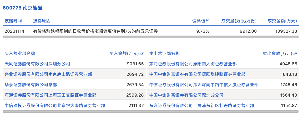 11月14日,南京熊猫今日涨停,全天换手率达14.75%,振幅达9.15%。龙虎榜数据显示,营业部席位合计净买入8761.99万元。其中,天风证券深圳分公司、兴业证券南京庐山路证券营业部分别买入9031.65万元、2694.72万元;东海证券溧阳南大街证券营业部、中国中金财富证券有限公司溧阳煤建路证券营业部分别卖出4045.65万元、1843.18万元。
