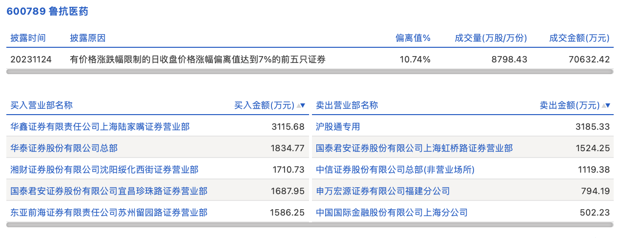 11月24日,鲁抗医药今日涨停,全天换手率达9.88%,振幅达8.85%。龙虎榜数据显示,营业部席位合计净买入2810.0万元。其中,华鑫证券上海陆家嘴证券营业部、华泰证券总部分别买入3115.68万元、1834.77万元;沪股通专用、国泰君安证券上海虹桥路证券营业部分别卖出3185.33万元、1524.25万元。