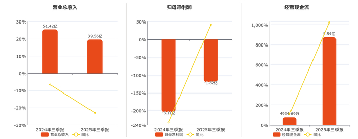 公司营业总收入为39.56亿元。归母净利润为-1.82亿元,较去年同报告期归母净利润增加1.29亿元。经营活动现金净流入为5.54亿元,较去年同报告期经营活动现金净流入增加5.04亿元,实现2年连续上涨,同比较去年同期上涨1021.86%。