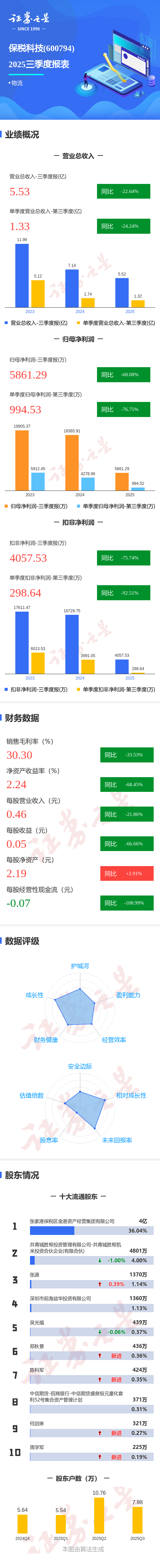 图解保税科技三季报:第三季度单季净利润同比下降76.76%