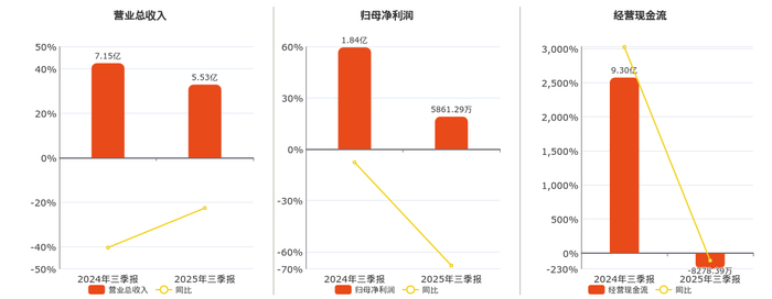 公司营业总收入为5.53亿元,较去年同报告期营业总收入减少1.62亿元,同比较去年同期下降22.65%。归母净利润为5861.29万元,较去年同报告期归母净利润减少1.25亿元,同比较去年同期下降68.09%。经营活动现金净流入为-8278.39万元,较去年同报告期经营活动现金净流入减少10.13亿元,同比较去年同期下降108.90%。