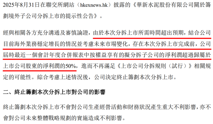 8月31日,华新水泥曾公告,计划将境外资产进行拆分并在境外交易所独立上市,但10月8日便宣布终止拆分上市,原因为“结合考虑海外业务增长情况,在分拆上市完成前,出海业务的净利润有可能超过归母净利润的50%,进而有可能不再满足《上市公司分拆规则(试行)》的相关规定。”