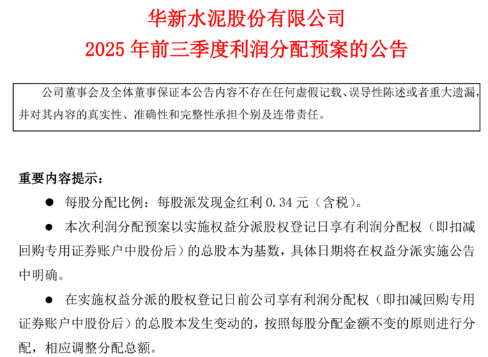 同时华新水泥宣布,董事会拟向全体股东分配2025年前三季度现金红利约7.06亿元,对应股利0.34 元/股(含税)。