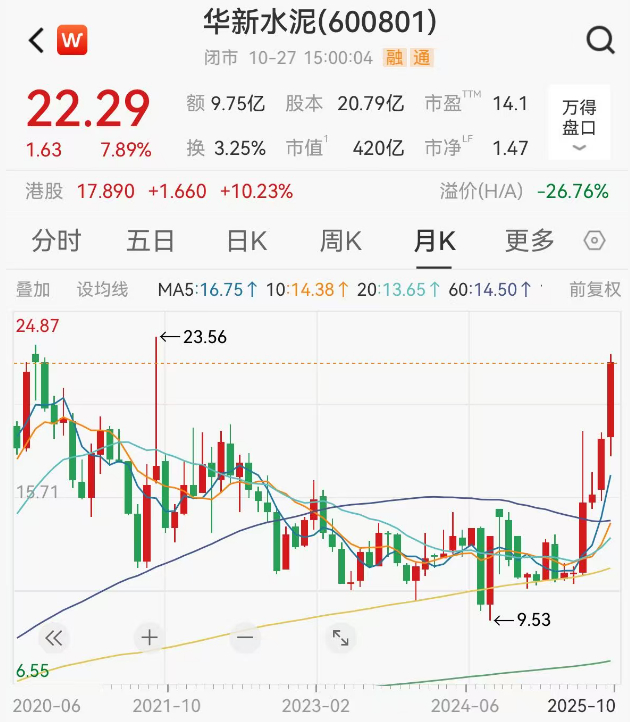 从股价表现上看,10月27日华新水泥港股上涨10.23%,A股上涨7.89%,港股和A股股价距离历史新高都只有一步之遥。