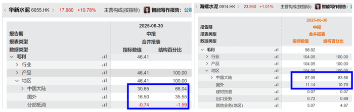 截止到2025H1,华新水泥海外业务收入44.26亿元,占总营收比例约27.58%,海外业务实现毛利润16.50亿元,占总毛利润比例约35.55%。对比海螺水泥(00914.HK),2025H1海外业务收入24.62亿元,占总营收比例约5.96%,海外业务实现毛利润11.14亿元,占总毛利润比例约10.70%。
