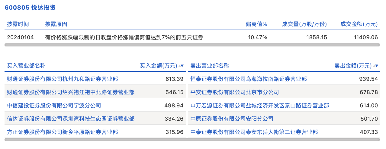 1月4日,悦达投资今日涨停,全天换手率达2.19%,振幅达0%。龙虎榜数据显示,营业部席位合计净卖出832.65万元。其中,财通证券杭州九和路证券营业部、财通证券绍兴袍江袍中北路证券营业部分别买入613.39万元、546.15万元;恒泰证券乌海海拉南路证券营业部、平安证券北京市分公司分别卖出939.54万元、678.78万元。