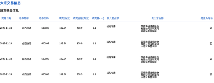11月28日,山西汾酒大宗交易成交4.4万股,成交额803.6万元,占当日总成交额的1.49%,成交价182.64元,较市场收盘价194.3元折价6%。