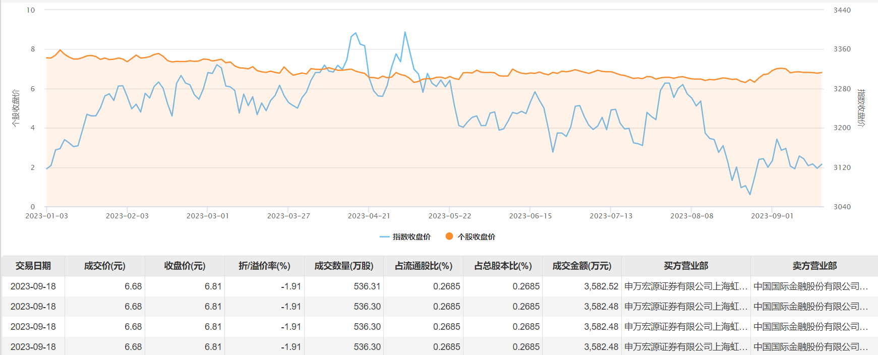 9月18日大宗交易成交2145.21万股,成交额1.43亿元,占当日总成交额的49.69%,成交价6.68元,较市场收盘价6.81元折价1.91%。
