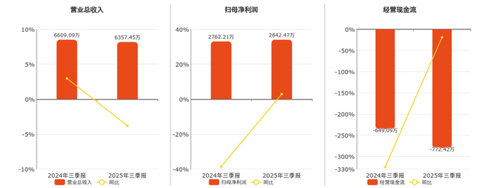 公司营业总收入为6357.45万元。归母净利润为2842.47万元,较去年同报告期归母净利润增加80.26万元,同比较去年同期上涨2.91%。经营活动现金净流入为-772.42万元。