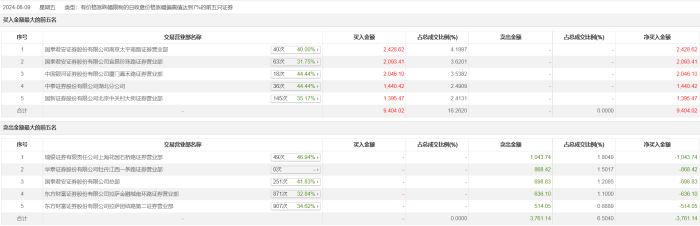 具体来看,知名游资现身龙虎榜,作手新一(国泰君安证券南京太平南路证券营业部)、国泰君安证券宜昌珍珠路证券营业部分别买入2428.62万元、2093.41万元;瑞银证券上海花园石桥路证券营业部、华泰证券牡丹江西一条路证券营业部分别卖出1043.74万元、868.42万元。