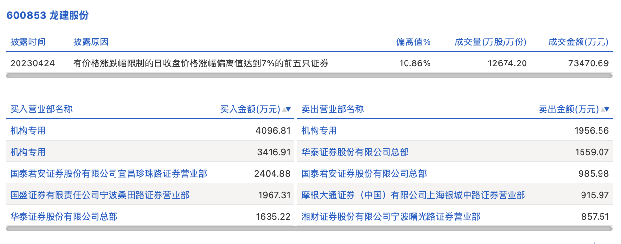4月24日,龙建股份今日涨停,龙虎榜数据显示,上榜营业部席位全天成交1.98亿元,占当日总成交金额比例为26.94%。其中,买入金额为1.35亿元,卖出金额为6275.09万元,合计净买入7246.04万元。