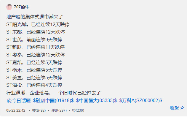 如今地产股该暴的雷基本都已经暴得差不多了,现在排队退市想来也不奇怪,毕竟我们未必需要那么多开发商,当资本炒作的热度退却,开发商们也该逐渐淡出市场了。