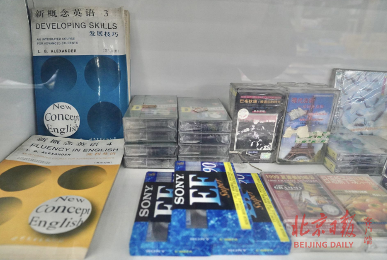 展出的老商品中,有《新概念英语》书和一些磁带,上世纪90年代初,一天配这种成套的磁带就得配100多套。