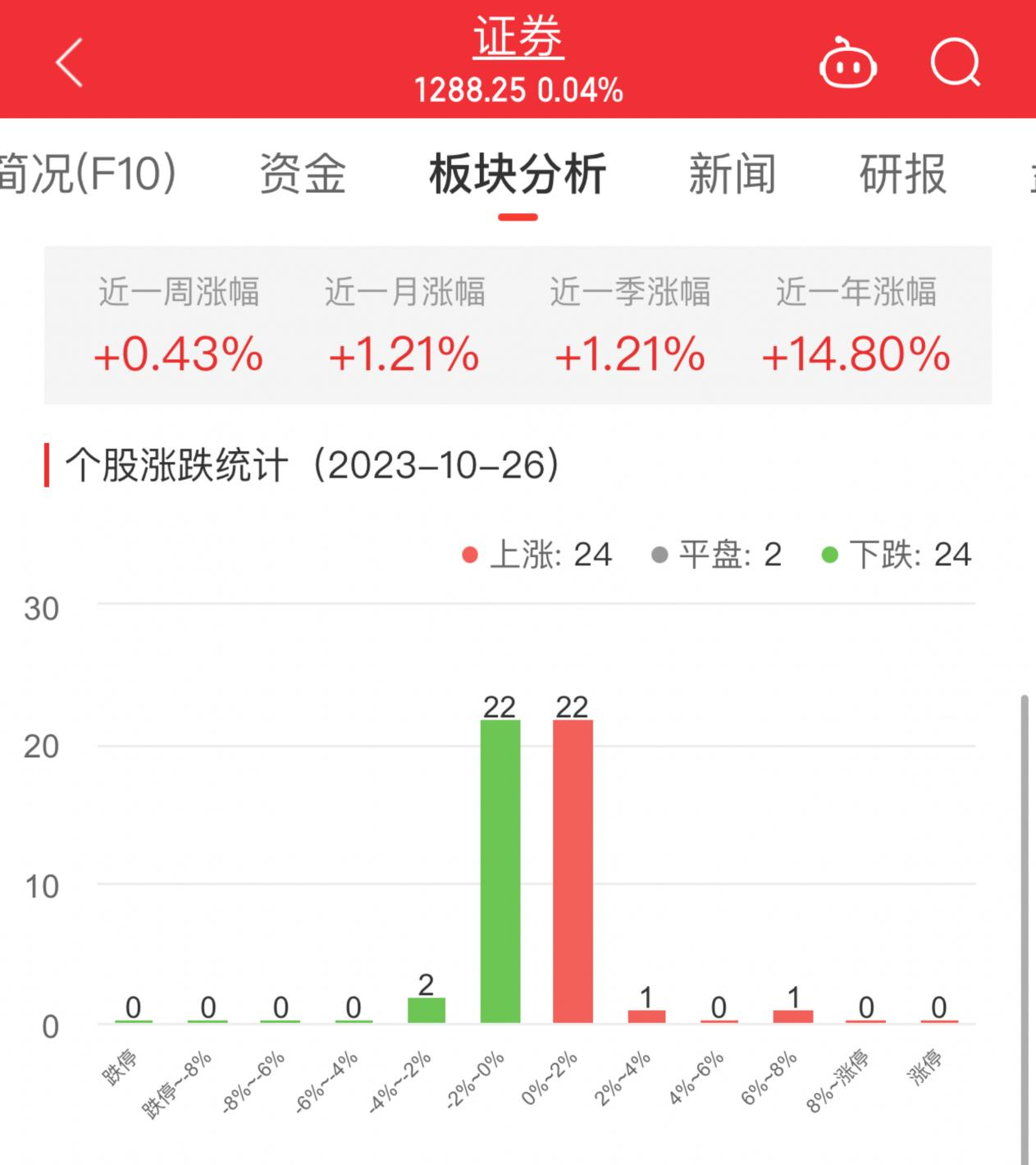 中国经济网北京10月26日讯 今日,证券板块整体涨幅0.04%,其中24只股票上涨,2只股票平盘,24只股票下跌。