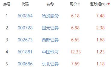其中,哈投股份、国元证券、西部证券、中国银河、东北证券位列板块涨幅前五位,涨幅分别为7.48%、2.38%、1.68%、1.23%、1.18%。