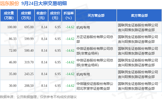 9月24日远东股份现6笔折价14.62%的大宗交易 合计成交2566.84万元