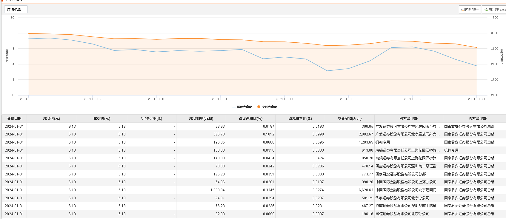 今日大宗交易成交2378.95万股,成交额1.46亿元,占当日总成交额的28.77%,成交价6.13元,较市场收盘价持平。