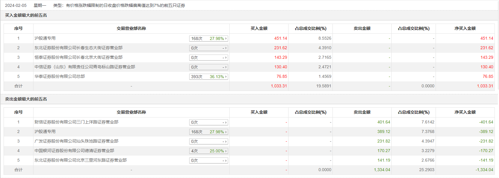2月5日,亚泰集团今日跌停,全天换手率达1.14%,振幅达8.97%。龙虎榜数据显示,营业部席位合计净卖出300.73万元。其中,财信证券三门上洋路证券营业部、沪股通专用分别卖出401.64万元、389.12万元;沪股通专用、东北证券长春生态大街证券营业部分别买入451.14万元、231.62万元。