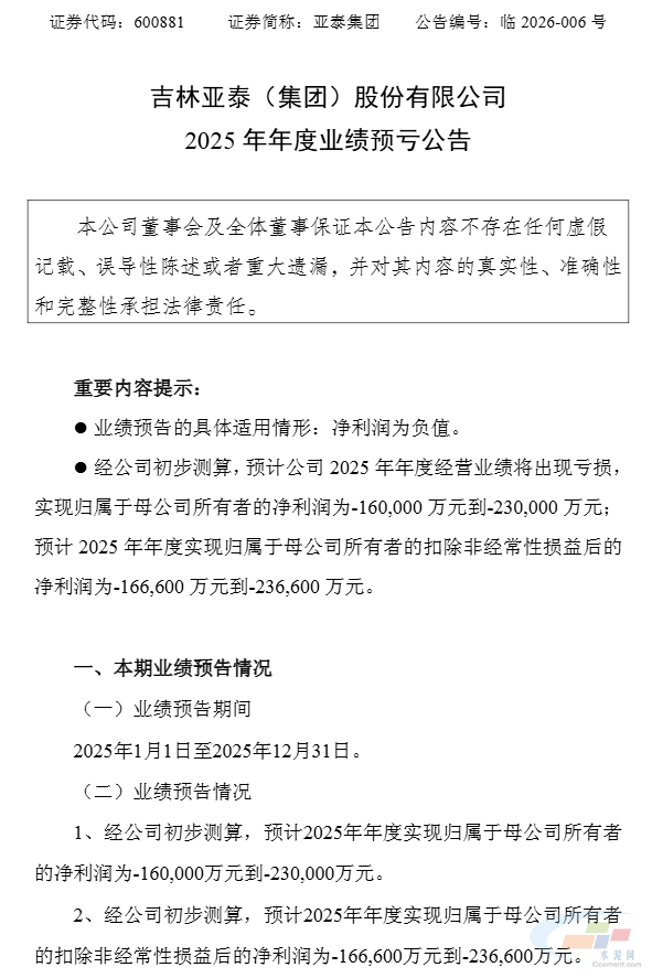 1月19日晚,亚泰集团发布业绩预告,经公司初步测算,预计公司2025年年度经营业绩将出现亏损,实现归属于母公司所有者的净利润为-16亿元到-23亿元(2024年同期净利润为-29.18亿元,2025年亏损同比收窄21.18%-45.17%);预计2025年年度实现归属于母公司所有者的扣除非经常性损益后的净利润为-16.66亿元到-23.66亿元。