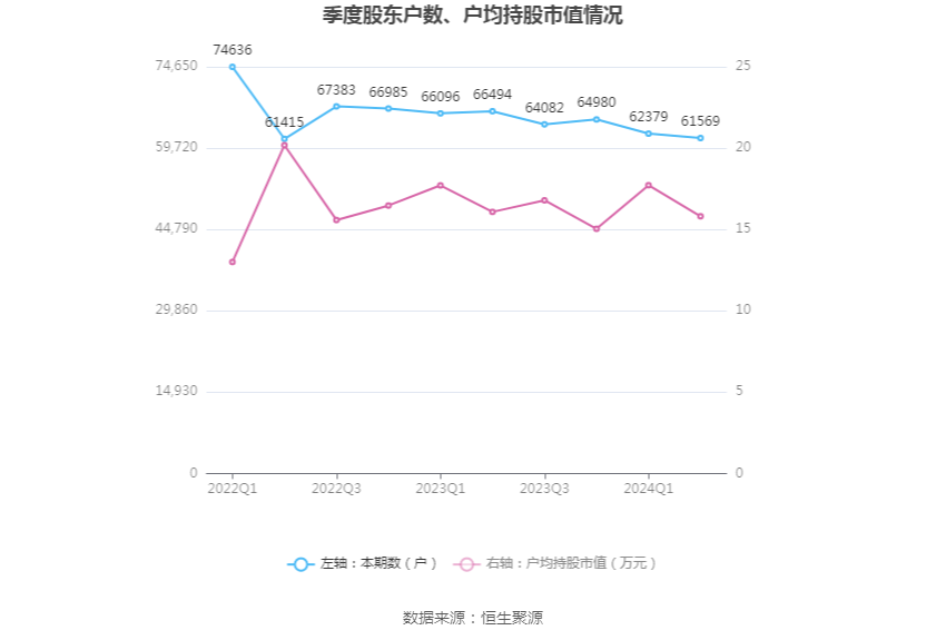 筹码集中度方面,截至2024年上半年末,公司股东总户数为6.16万户,较一季度末下降了810户,降幅1.30%;户均持股市值由一季度末的17.72万元下降至15.81万元,降幅为10.78%。