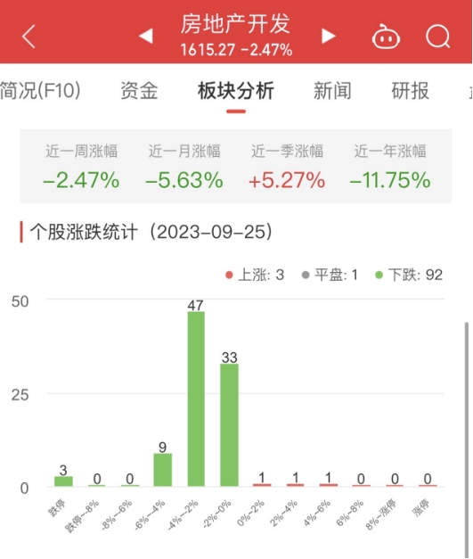 中国经济网北京9月25日讯今日,房地产开发板块整体涨幅-2.47%,其中3只股票上涨,1只股票平盘,92只股票下跌。