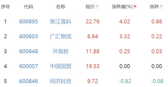 其中,张江高科、广汇物流、外高桥、中国国贸、同济科技位列板块涨幅榜前五位,涨幅分别为4.02%、3.32%、0.25%、0.00%、-0.82%。