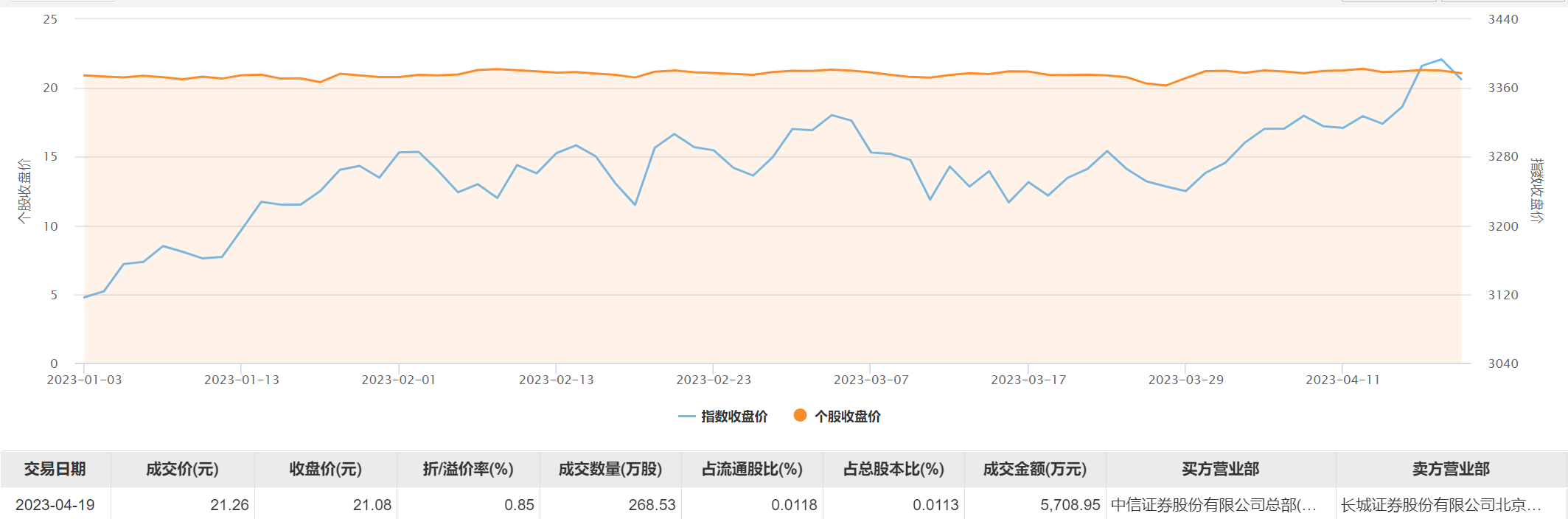 4月19日大宗交易成交268.53万股,成交额5708.95万元,占当日总成交额的3.59%,成交价21.26元,较市场收盘价21.08元溢价0.85%。