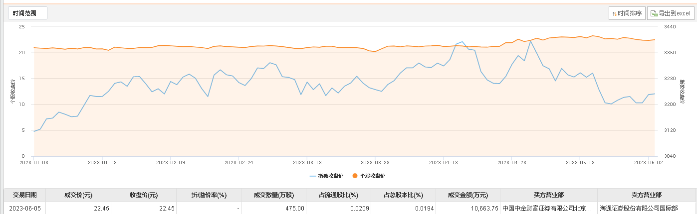 6月5日大宗交易成交475万股,成交额1.07亿元,占当日总成交额的13.04%,成交价22.45元,较市场收盘价22.45元持平。