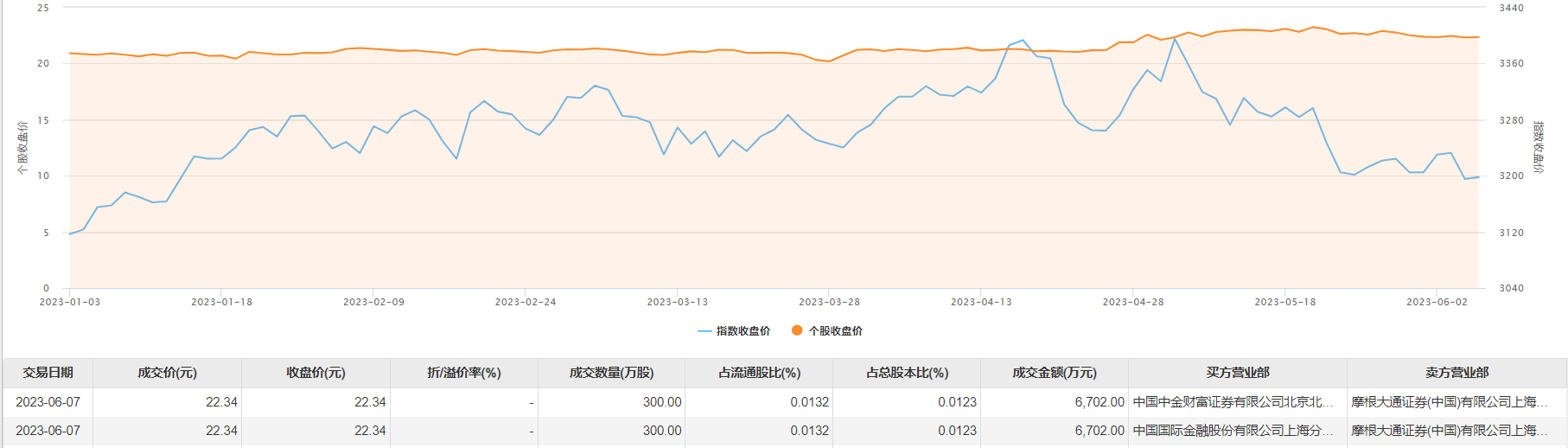 6月7日大宗交易成交600万股,成交额1.34亿元,占当日总成交额的15.67%,成交价22.34元,较市场收盘价22.34元持平。