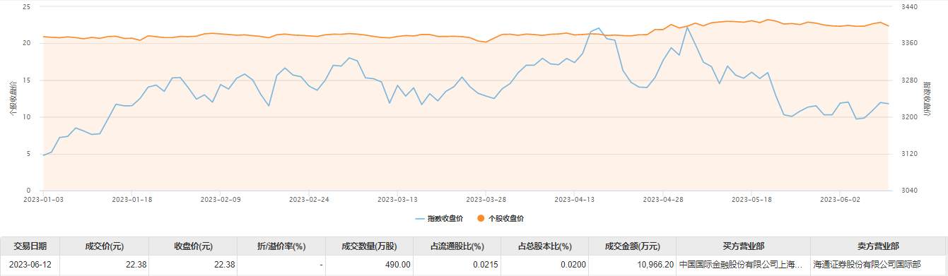 6月12日大宗交易成交490万股,成交额1.1亿元,占当日总成交额的9.04%,成交价22.38元,较市场收盘价22.38元持平。