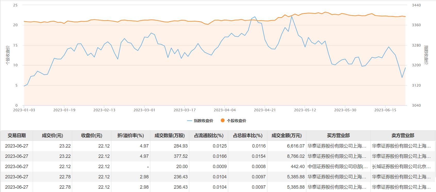 长江电力6月27日大宗交易成交1155.31万股,成交额2.66亿元,占当日总成交额的24%,成交均价23.02元,较市场收盘价22.12元溢价4.07%,其中最高成交价23.22元,最低成交价22.12元。