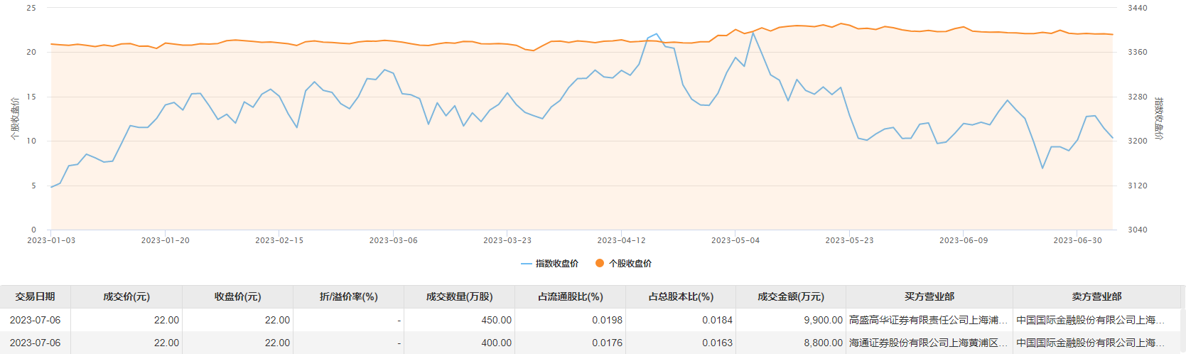 7月6日大宗交易成交850万股,成交额1.87亿元,占当日总成交额的19.59%,成交价22元,较市场收盘价22元持平。