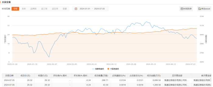 今日大宗交易成交340.01万股,成交额9969.06万元,占当日总成交额的3.29%,成交价29.32元,较市场收盘价持平。
