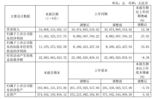 净利润:上半年归属于上市公司股东的净利润为113.62亿元,同比增长27.92%;