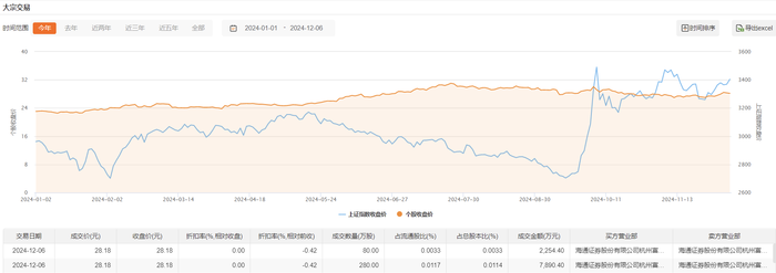 今日大宗交易成交360万股,成交额1.01亿元,占当日总成交额的3.8%,成交价28.18元,较市场收盘价持平。