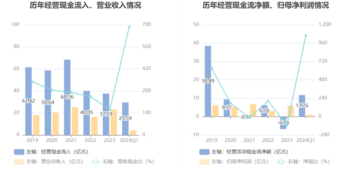 2024年第一季度,公司经营活动现金流净额为11.76亿元,同比增长11.18%;筹资活动现金流净额9.88亿元,同比增加10.04亿元;投资活动现金流净额-461.19万元,上年同期为-1688.84万元。