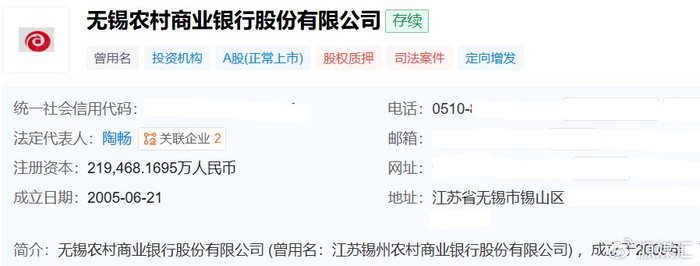 天眼查显示,无锡银行成立于2005年6月21日,注册资本21.95亿元,法定代表人陶畅,其亦是董事长。
